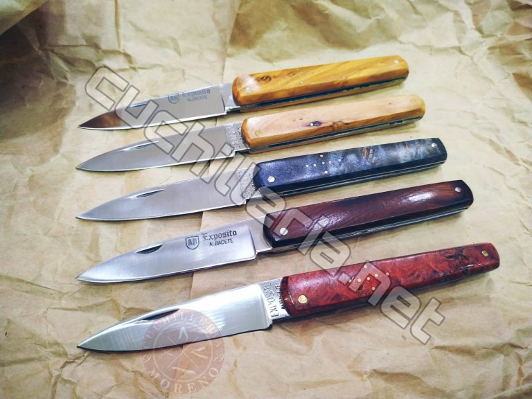 Novedad Navaja Artesana Expósito Albacete Machete Estos son los nuevos modelos de navajas tipo machete con las cachas en maderas, hueso y cuerno. Estas navajas artesanas de Albacete fabricadas por cuchillería Expósito están fabricadas con acero inoxidable Sandvik 12C27 con una longitud de hoja de 6,5cm Estarán muy pronto disponible en nuestra cuchilleria online y …