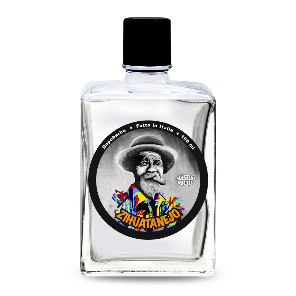 Aftershave Zihuatanejo recuerda México. El encuentro entre Mastro Miche ‘ y Daniele Sorrenti, diseñador gráfico, pintor y trotamundos también es inevitable; así, “el hombre del puro” se convierte en el emblema del jabón de afeitar Zihuatanejo, fragancia fresco e espinoso, domesticado porextracto de aloe, del aceite esencial de Litsea Cubeba y por ‘Aceite de semilla de uva.