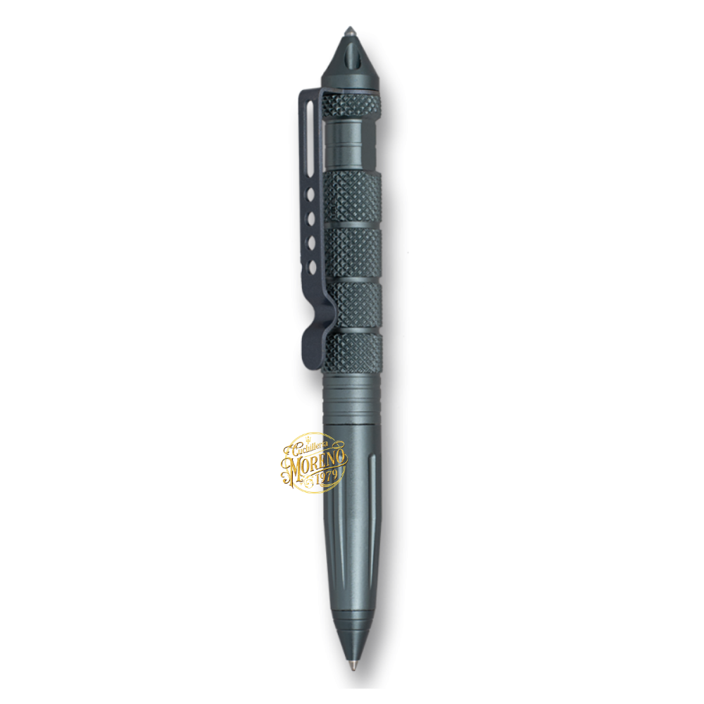 El diseño incluye un clip de sujeción robusto y perforado, perfecto para asegurar el bolígrafo en un bolsillo, mochila o cinturón, manteniéndolo siempre al alcance. Además, su apariencia táctica y elegante en color gris lo hace discreto, combinando funcionalidad y estilo.