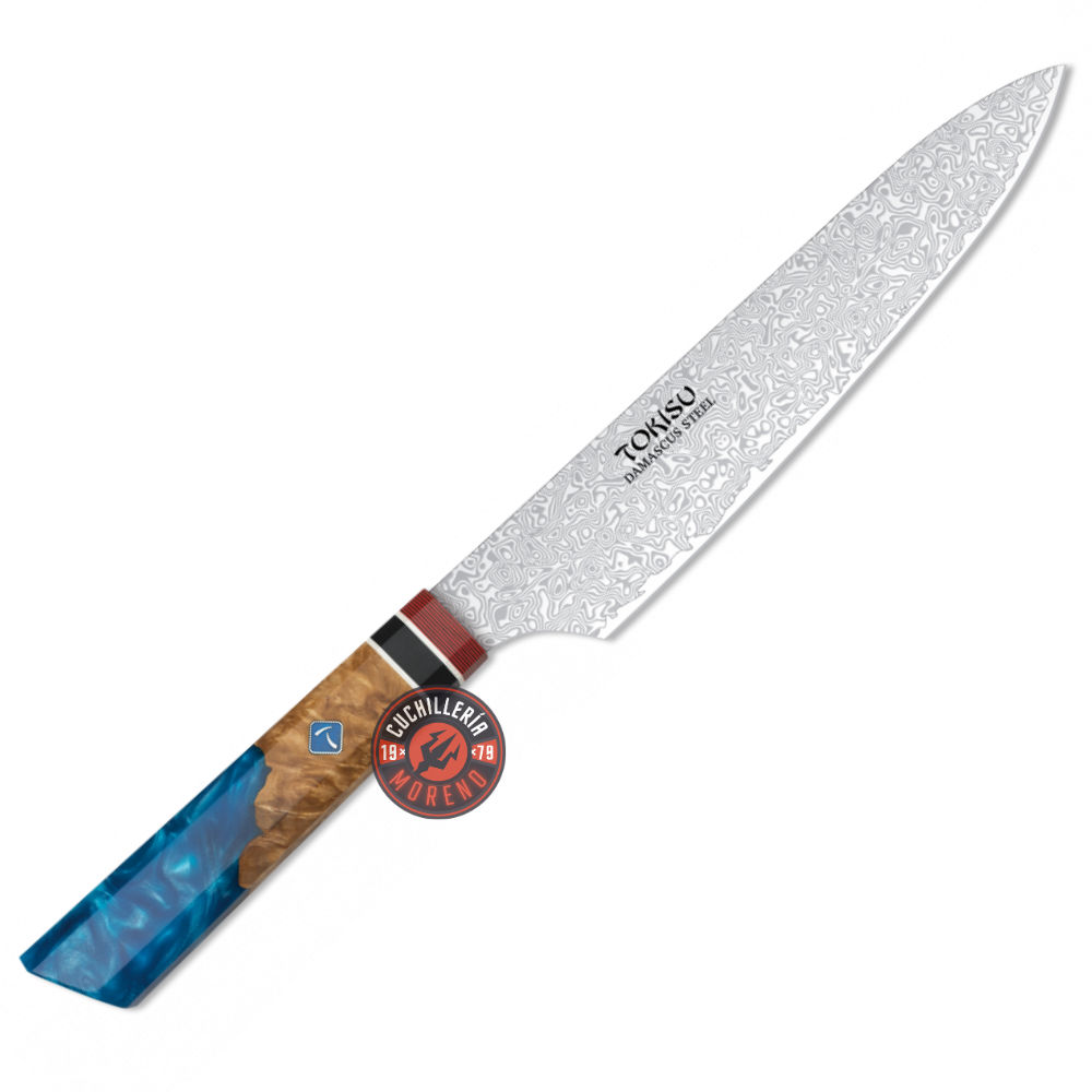 El Cuchillo de Cocina Damasco SMALL GYUTO de TOKISU destaca por su hoja de 19.50 cm fabricada en acero Damasco, famoso por su resistencia y capacidad para mantener un filo duradero. El mango de Staypak no solo proporciona un agarre ergonómico y confortable, sino que también añade un toque estético al cuchillo. Como parte de la reconocida marca TOKISU, este cuchillo garantiza calidad y rendimiento superior, siendo una herramienta versátil ideal para una amplia gama de tareas culinarias. Su combinación de materiales de alta calidad, durabilidad y diseño ergonómico lo convierten en una elección excepcional para chefs y aficionados a la cocina.