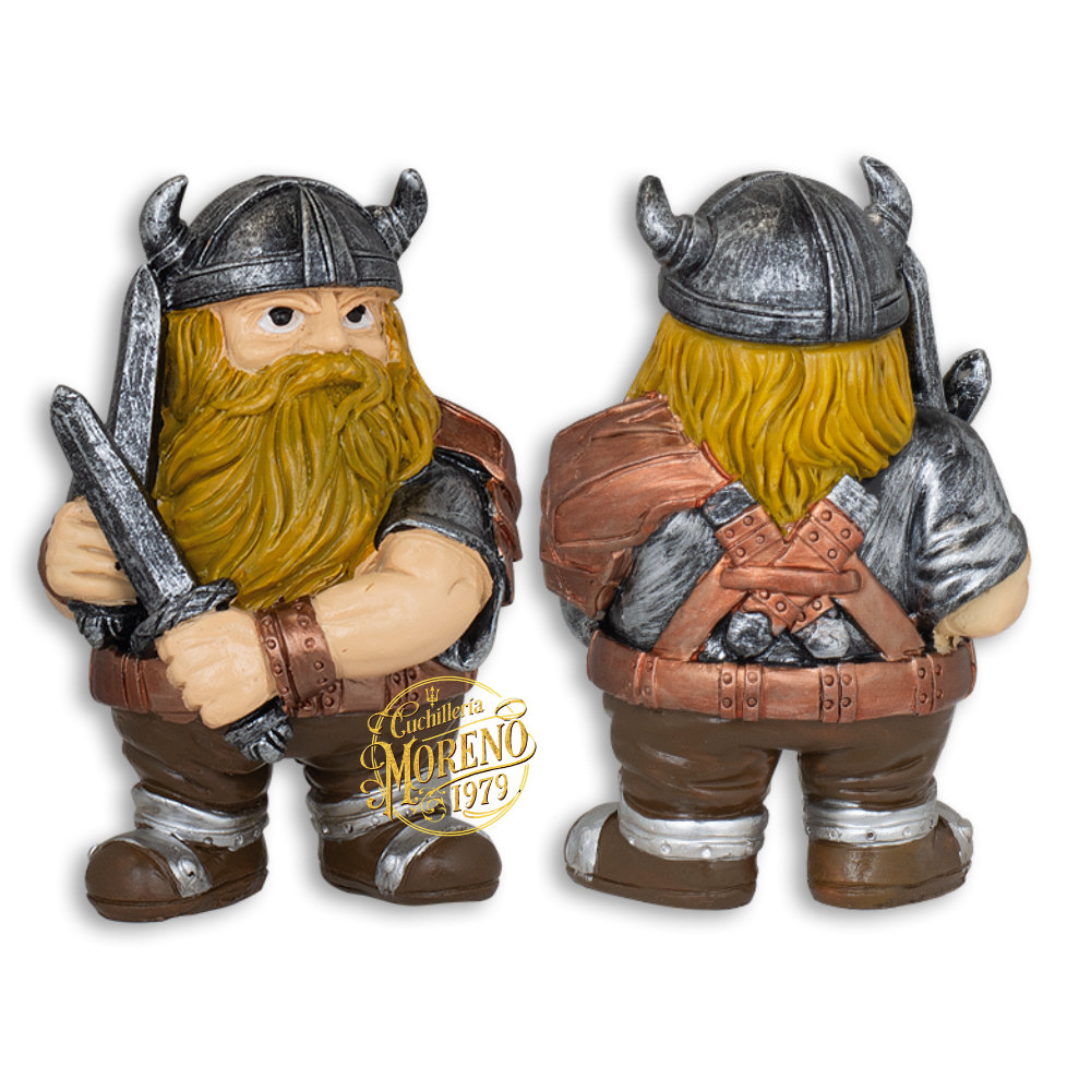 Este vikingo de 10.5 cm se presenta con una postura desafiante, empuñando una espada corta en la mano derecha, mientras que otra se encuentra envainada en su espalda. Su expresión seria, su larga barba rubia y su casco de metal con cuernos le dan un aspecto de auténtico guerrero escandinavo.