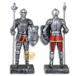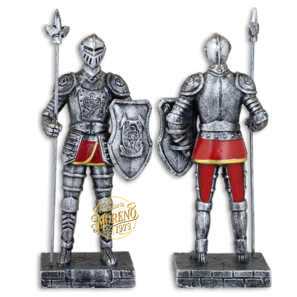 Figura Caballero Medieval con lanza de la marca TOLE10, fabricada en resina de 20 cm de altura, con acabados en plateado envejecido, detalles rojos y dorados, escudo y lanza. Ideal para decoración temática o coleccionistas medievales.