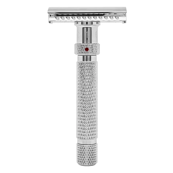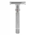 La maquinilla de afeitar ajustable Blazer combina precisión y calidad. Hecha de latón y zamak con cromado brillante, ofrece 6 niveles de corte, desde suave hasta efectivo. Su diseño facilita el cambio de hoja y es ideal tanto para barbas largas como para afeitados diarios. Específicamente recomendada para quienes cambian frecuentemente de estilo.