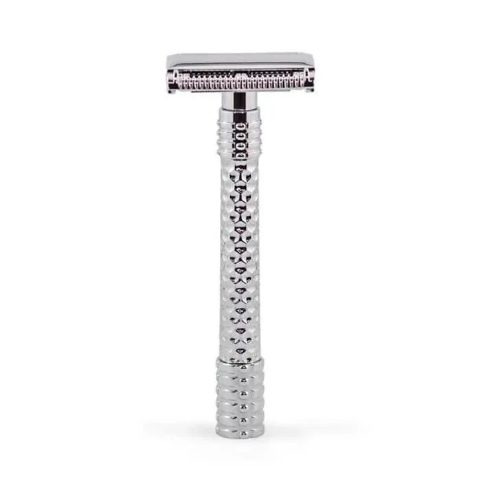 Esta maquinilla de afeitar de seguridad se caracteriza por su sistema de apertura de mariposa, también conocido como “alas” que se abren y cierran utilizando un pasador situado en la parte inferior del mango. Para ajustar el espacio de afeitado y cambiar la agresividad del corte, simplemente se utiliza el mismo pasador debajo de la placa.
