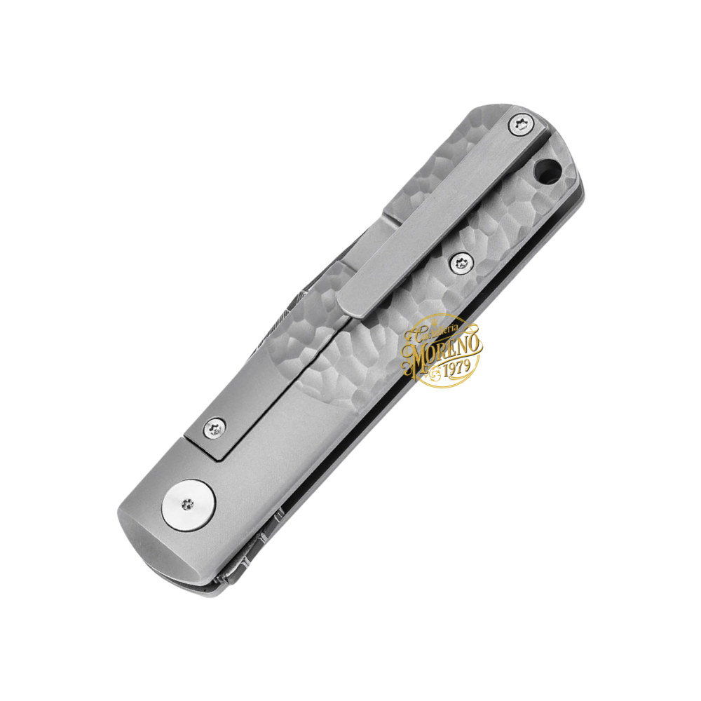 🔒 Sistema de cierre framelock integrado con inserto endurecido que asegura la hoja con firmeza. Se abre mediante un flipper oculto, lo que aporta limpieza al diseño cuando está desplegada.