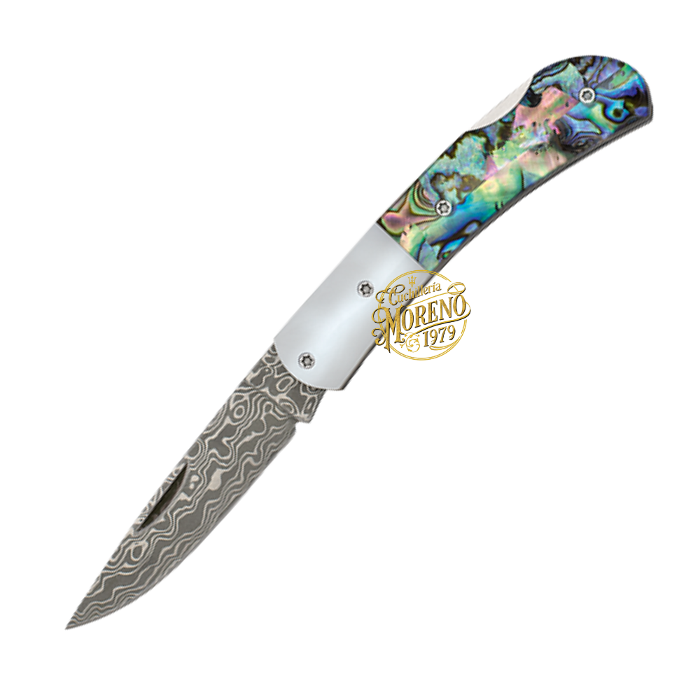 El mango de nácar bicolor, con acabado brillante e iridiscente, recuerda la elegancia natural de las conchas de abulón, aportando un toque sofisticado y exclusivo. Su virola metálica realza aún más el diseño y asegura un refuerzo extra en la estructura. Además, incorpora tornillos visibles, que garantizan un montaje sólido y de larga duración.