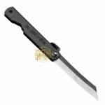 El mango doblado del Higo Kyoso está hecho de acero inoxidable oscuro y presenta un sutil orificio para cordón .