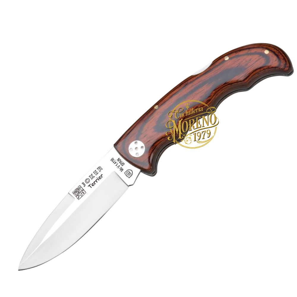 La JOKER TERRIER SP (Spear Point) Madera Roja (NR20) es una navaja de caza artesanal fabricada en Albacete, el corazón de la cuchillería española. Este modelo destaca por su hoja Spear Point satinada, que ofrece una punta más centrada y una simetría perfecta para cortes controlados y penetrantes.