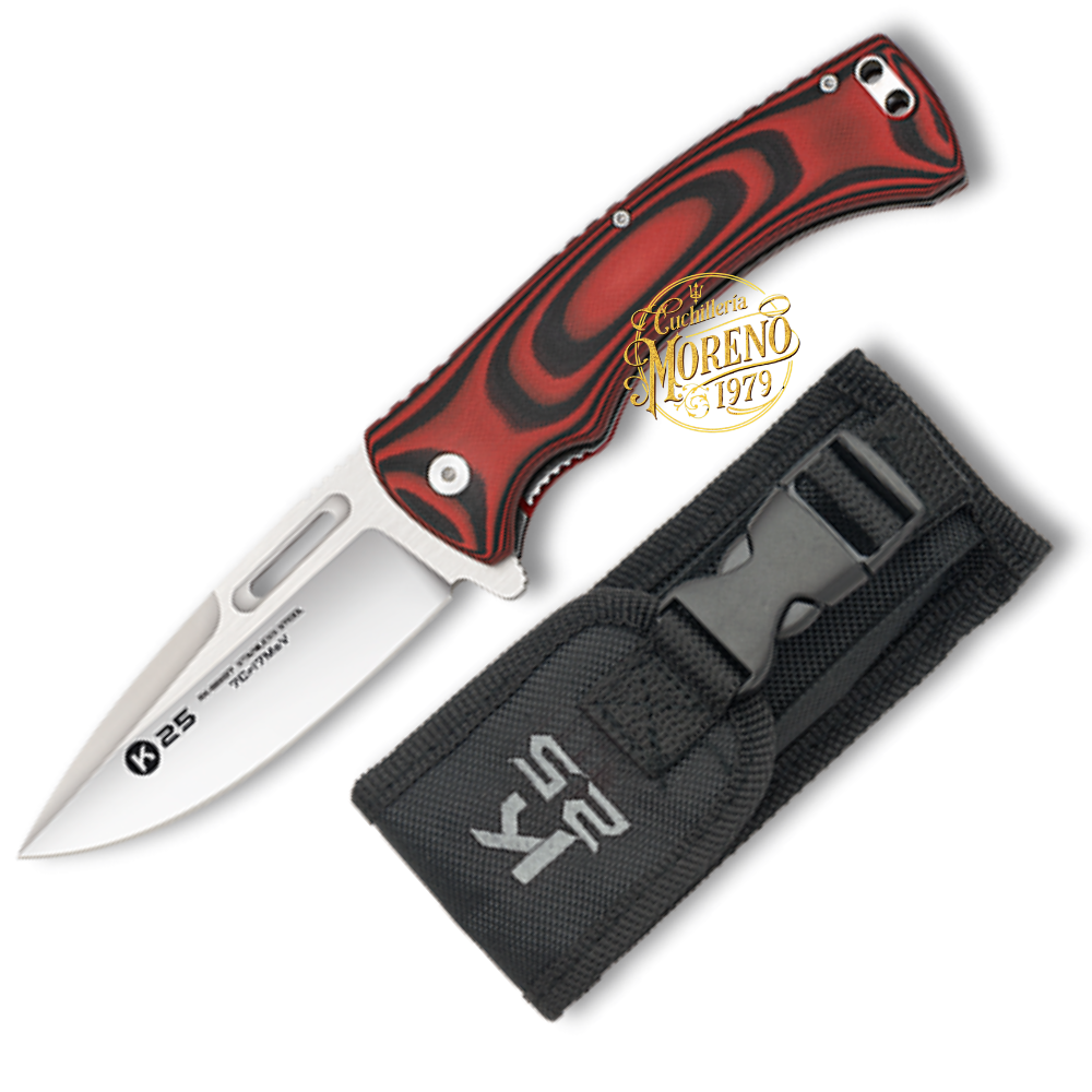 La navaja K25 CNC G.10 Rojo-Negro es una opción excepcional para aventureros y profesionales que buscan calidad y diseño en una sola herramienta. Su hoja de acero 7Cr17MoV de 9,8 cm con acabado satinado garantiza un corte preciso y duradero, mientras que su mango de G10 con apariencia de madera Wengué rojo combina elegancia y resistencia. Destaca por su sistema de apertura con flipper y agujero en la hoja, junto con un bloqueo Liner Lock para máxima seguridad. Incluye agujero para paracord y funda de nylon negro para mayor comodidad y protección.