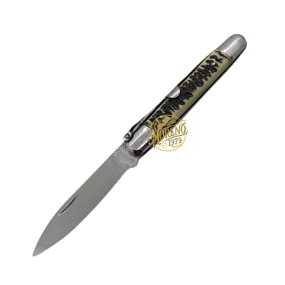 🔹 El sistema de apertura tradicional mediante muelle exterior de alillas con palanquilla garantiza un funcionamiento sólido, confiable y duradero. Este mecanismo es característico de las navajas machete y proporciona ese toque clásico que muchos coleccionistas y usuarios siguen buscando.