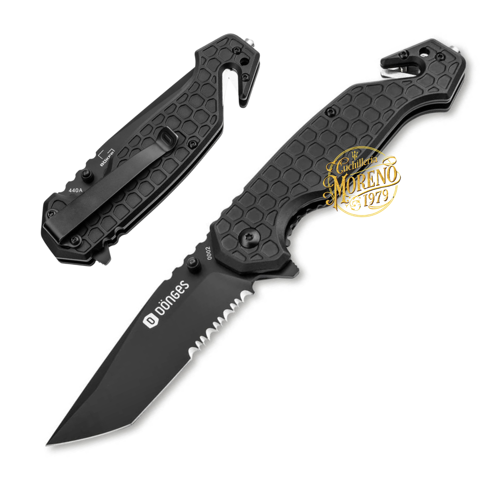 La Navaja Táctica Dönges Basic Tactical es una herramienta versátil diseñada para uso diario y situaciones de emergencia. Con una hoja de acero 440A tipo tanto de 8,70 cm y mango de aluminio 6061 con diseño antideslizante, ofrece resistencia, fiabilidad y ergonomía superior. Incluye características como un rompevidrios, corta cinturones y clip de acero, siendo ideal para personal militar y de rescate.