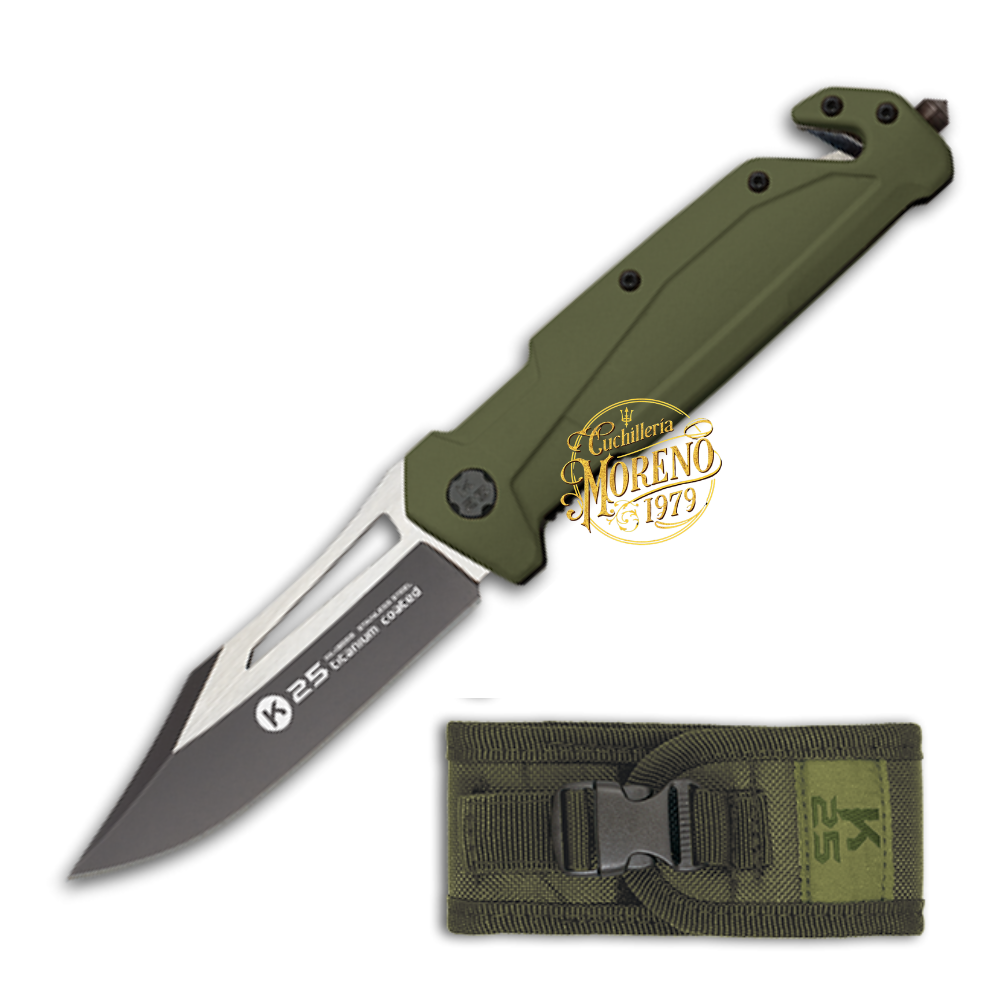 La navaja táctica K25 con mango engomado verde es una herramienta diseñada para ofrecer resistencia, durabilidad y un manejo seguro, ideal para situaciones tácticas, actividades al aire libre o trabajos exigentes.