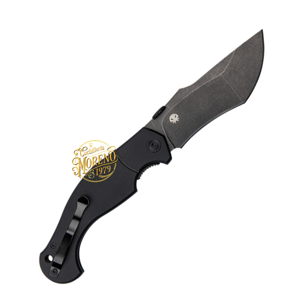 Su hoja de 102 mm en acero D2 con acabado negro lavado a la piedra proporciona una estética oscura, elegante y funcional. El acero D2 asegura una alta resistencia al desgaste y una excelente capacidad de corte prolongado.