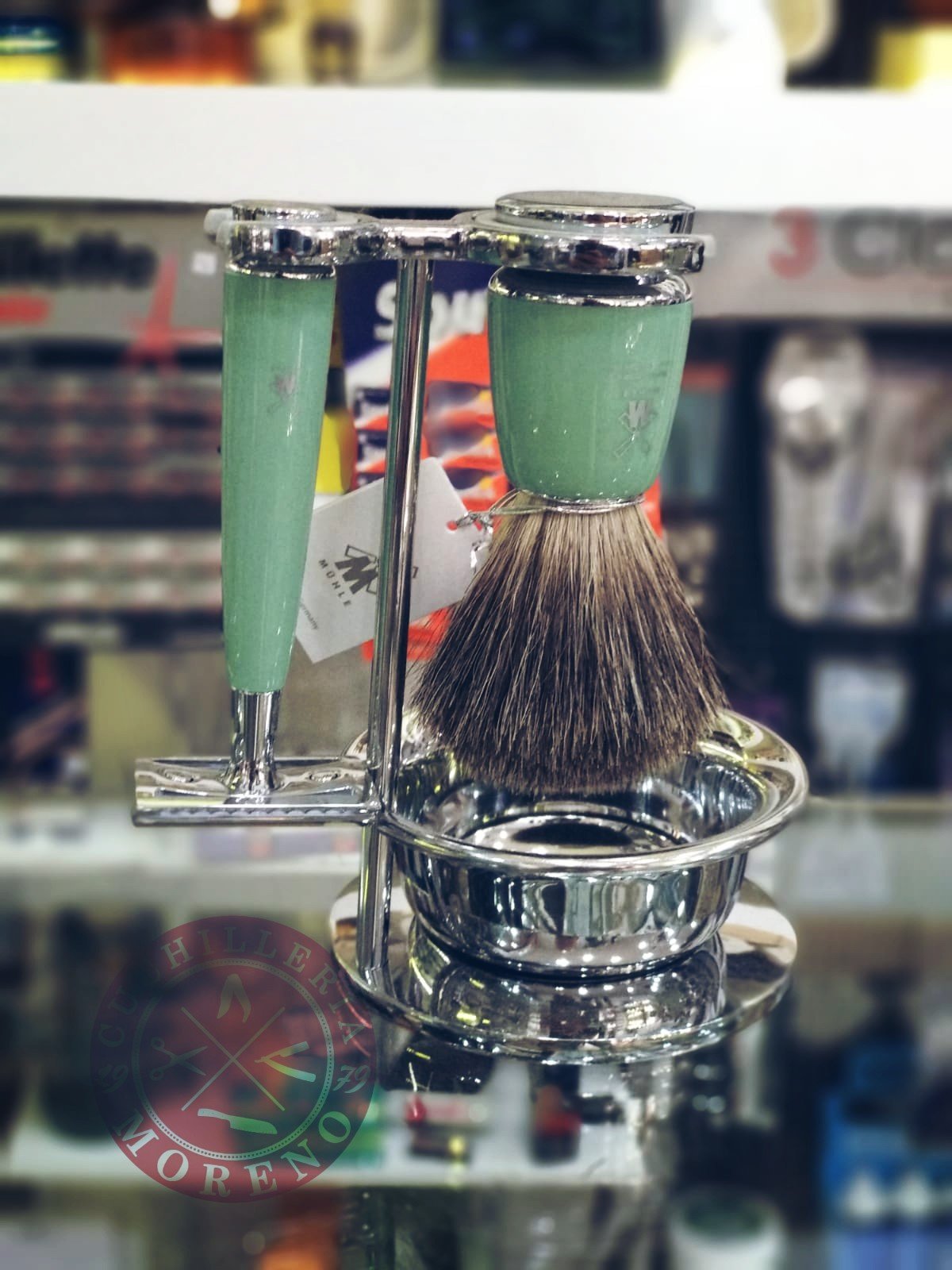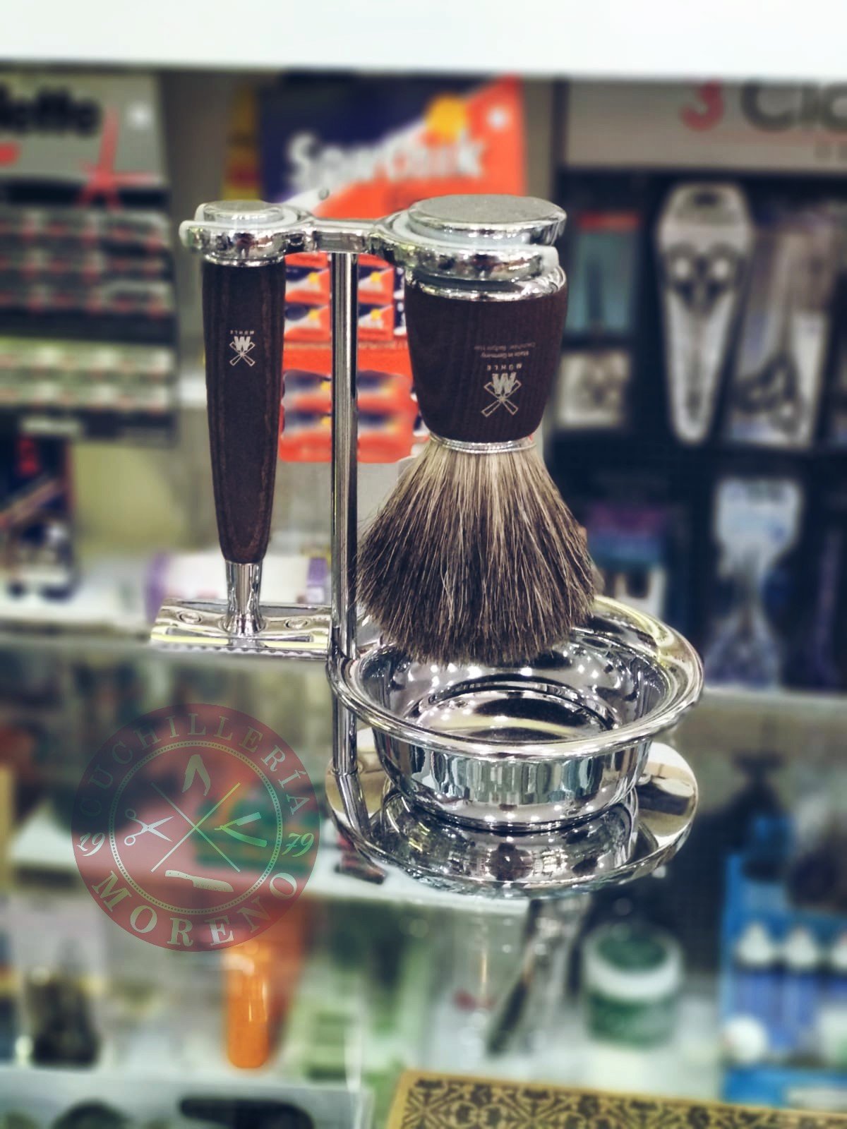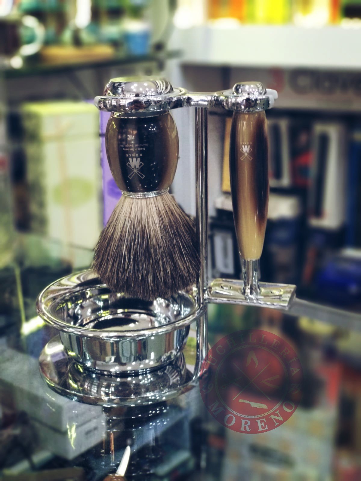 Se trata de unos set de afeitar con la maquinilla clásica y brocha en pelo de tejón gris y punta de plata en el de acero inoxidable de Muhle.